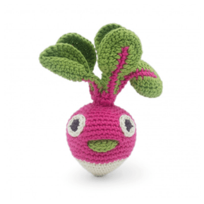 Louie le mini radis – Hochet en crochet coton bio pour bébé 3 mois et +