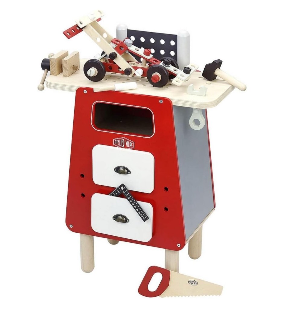 Cet établi en bois au look vintage de la marque Vilac ravira tous les petits bricolos qui pourront visser, tourner, scier, marteler, mesurer comme les grands avec les nombreux accessoires.