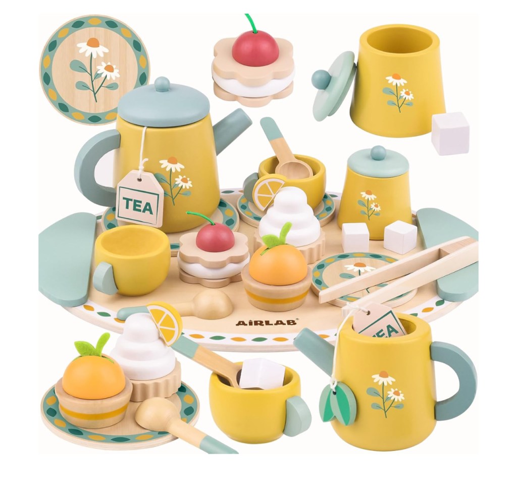 Ce coffret complet de dînette en bois contient tout ce qu’il faut pour inviter les copains, les copines, les poupées et les doudous à boire le thé !